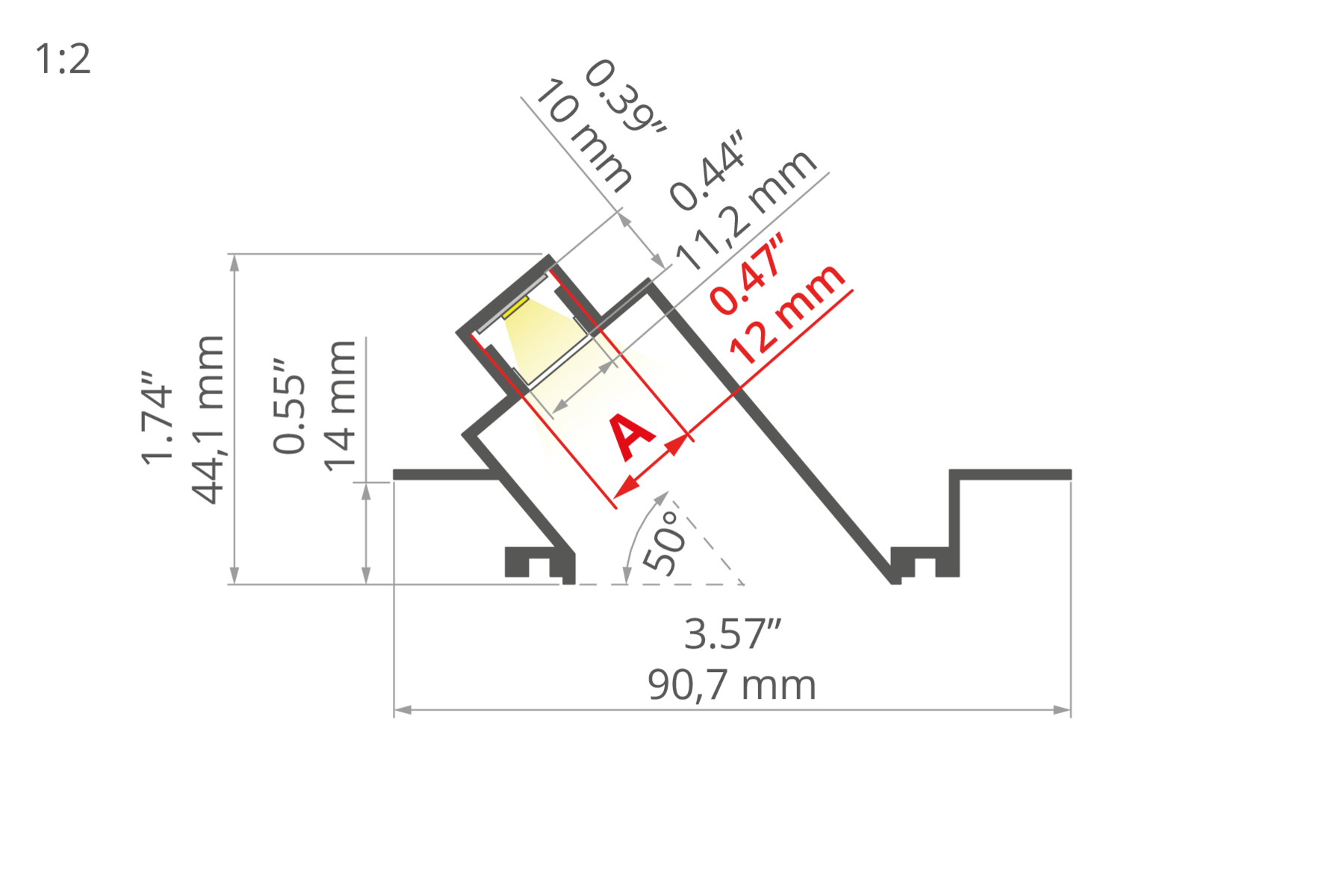 - Świecenie pod kątem 50 stopni