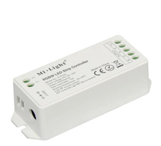 Kontroler FUT044 Mi-Light jest urządzeniem przeznaczonym do współpracy z taśmami LED RGB+W. Kontroler LED RGB+W pozwala na płynną regulację jasności, koloru światła oraz saturacji. Sterowanie światłem białym odbywa się na wydzielonym do tego kanale. Praca urządzenia jest możliwa w zakresie 12-24V DC a maksymalna moc nie może przekroczyć 6A na kanał (72W przy instalacji 12V i 144W przy instalacji 24V) oraz 15A mocy całkowitej (180W przy instalacji 12V i 360W przy instalacji 24V). Kontroler LED może być sterowany za pomocą pilota lub aplikacji na smartfona (wymagany mostek Wi-Fi iBOX), Kontroler LED RGBW MI-Light może być sterowany nawet z 4 różnych urządzeń jednocześnie. Dodatkowo kontroler pełni funkcję repeatera, co przy zachowaniu 30m odstępów między kolejnymi kontro