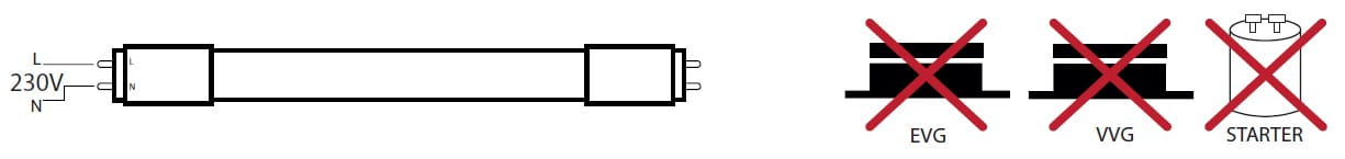 - Zasilanie 230V podłączyć do oprawki świetlówki.