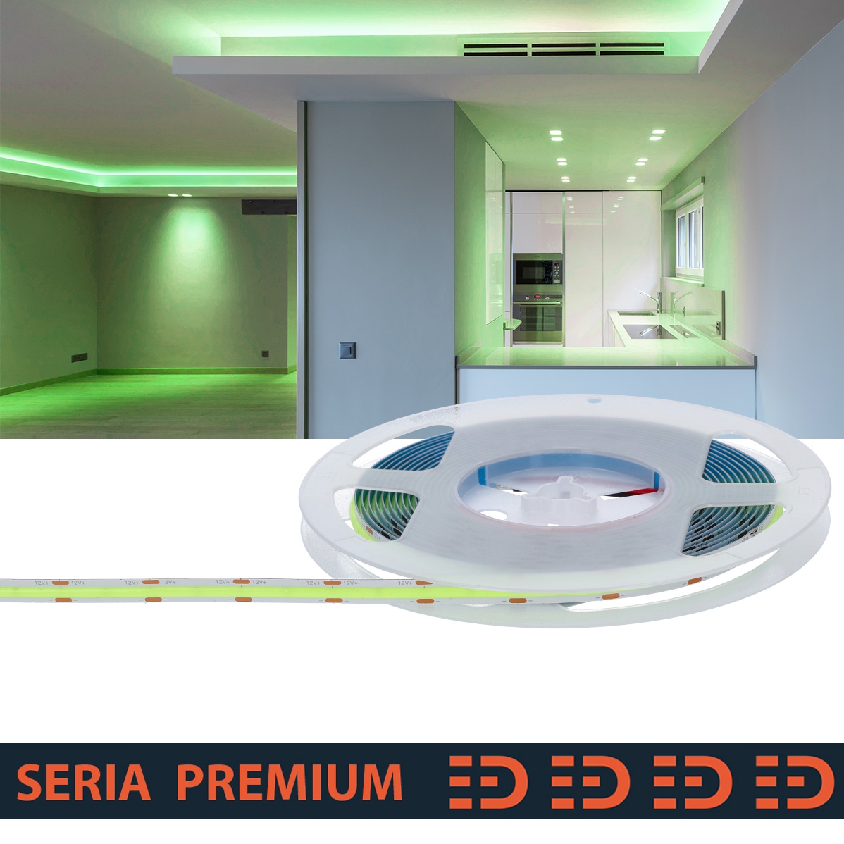 Taśmy Premium sprawdzają się jako oświetlenie wybranych stref, na przykład blatu roboczego w kuchni, lustra w łazience czy podwieszonego sufitu w salonie. To produkt dla wszystkich tych, którzy szukają kompromisu między jakością i ceną. Dobre podłoża PCB na którym umieszczone są wyselekcjonowane diody LED to gwarancja niezawodności.